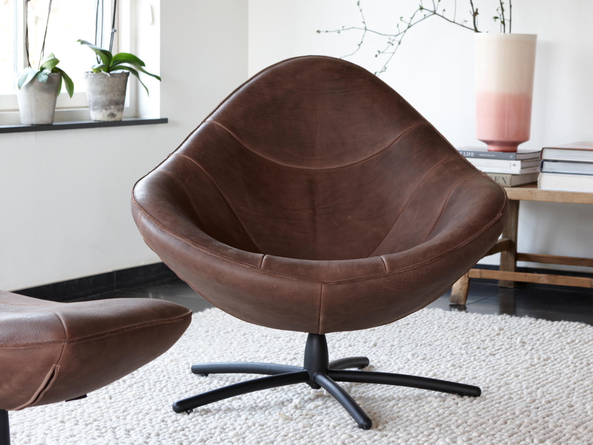 Le fauteuil et le cuir sont mis totalement en valeur. La forme du fauteuil évoque un gant de base-ball.