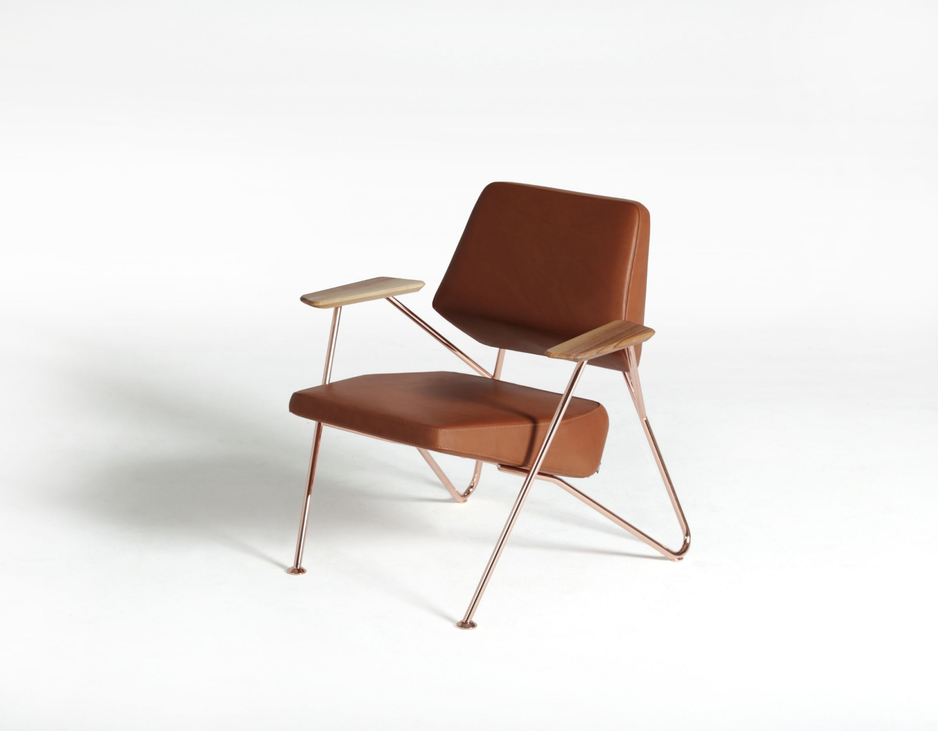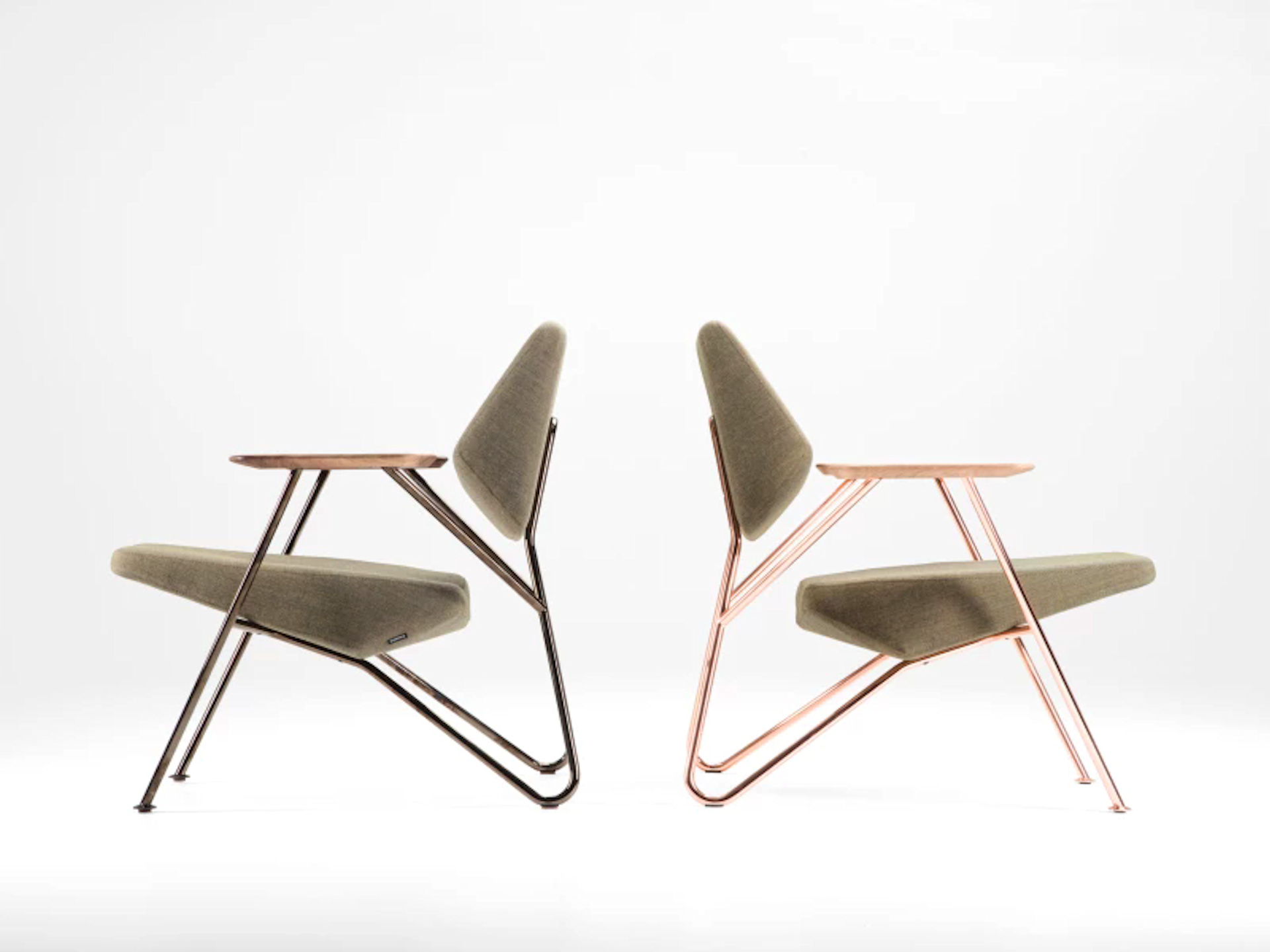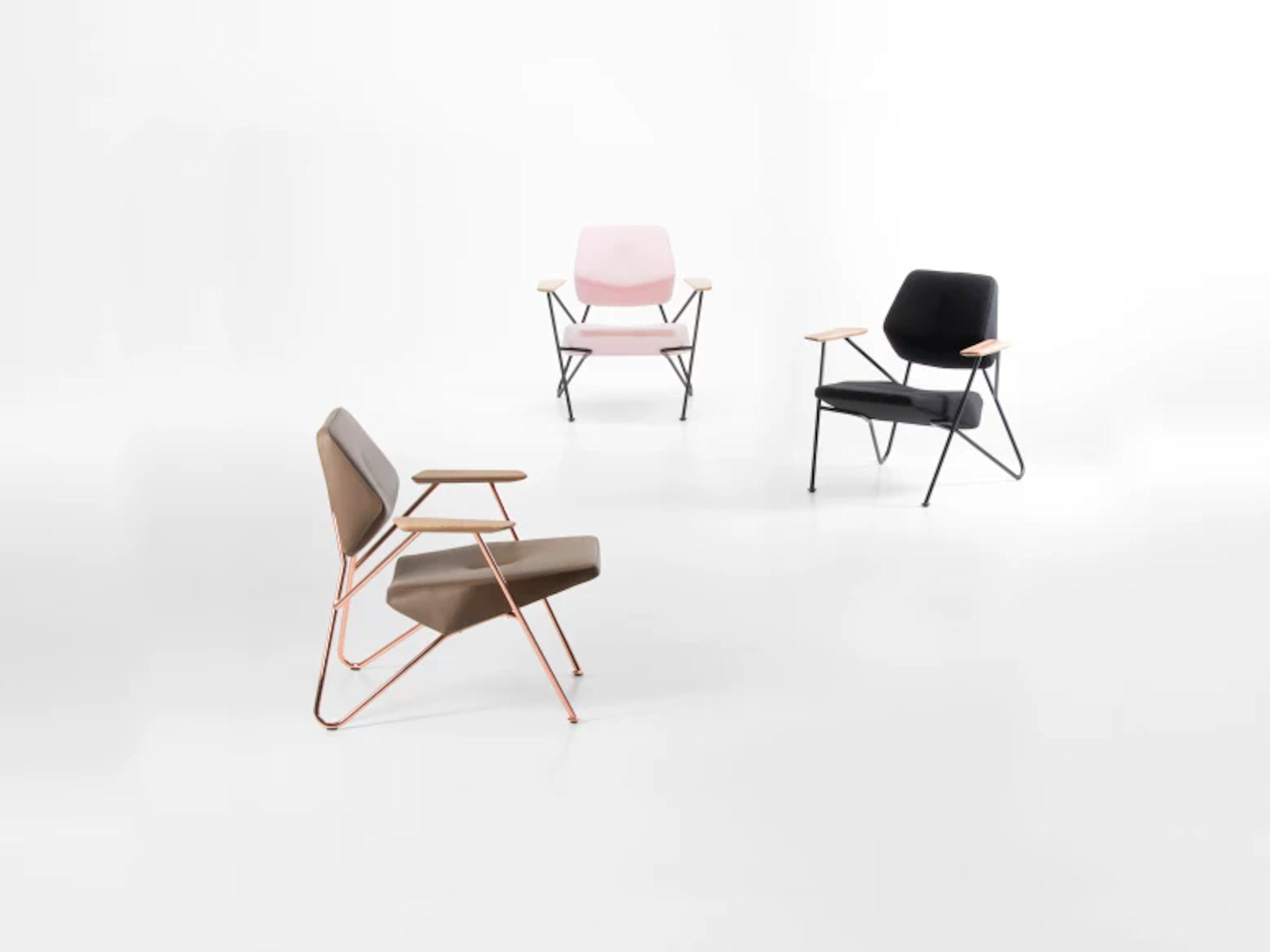 Polygon garde les éléments traditionnels d’un fauteuil moderne, mais crée une toute autre relation entre eux en les déstructurant. La forme de la structure en barres d’acier pliées, l’assise et le dossier sont cordonnées selon une géométrie triangulaire. Vue de profil, la composition du triangle est mise en avant, mais lorsque l’observateur se déplace, ces formes se transforment en hexagones et polygones complexes.