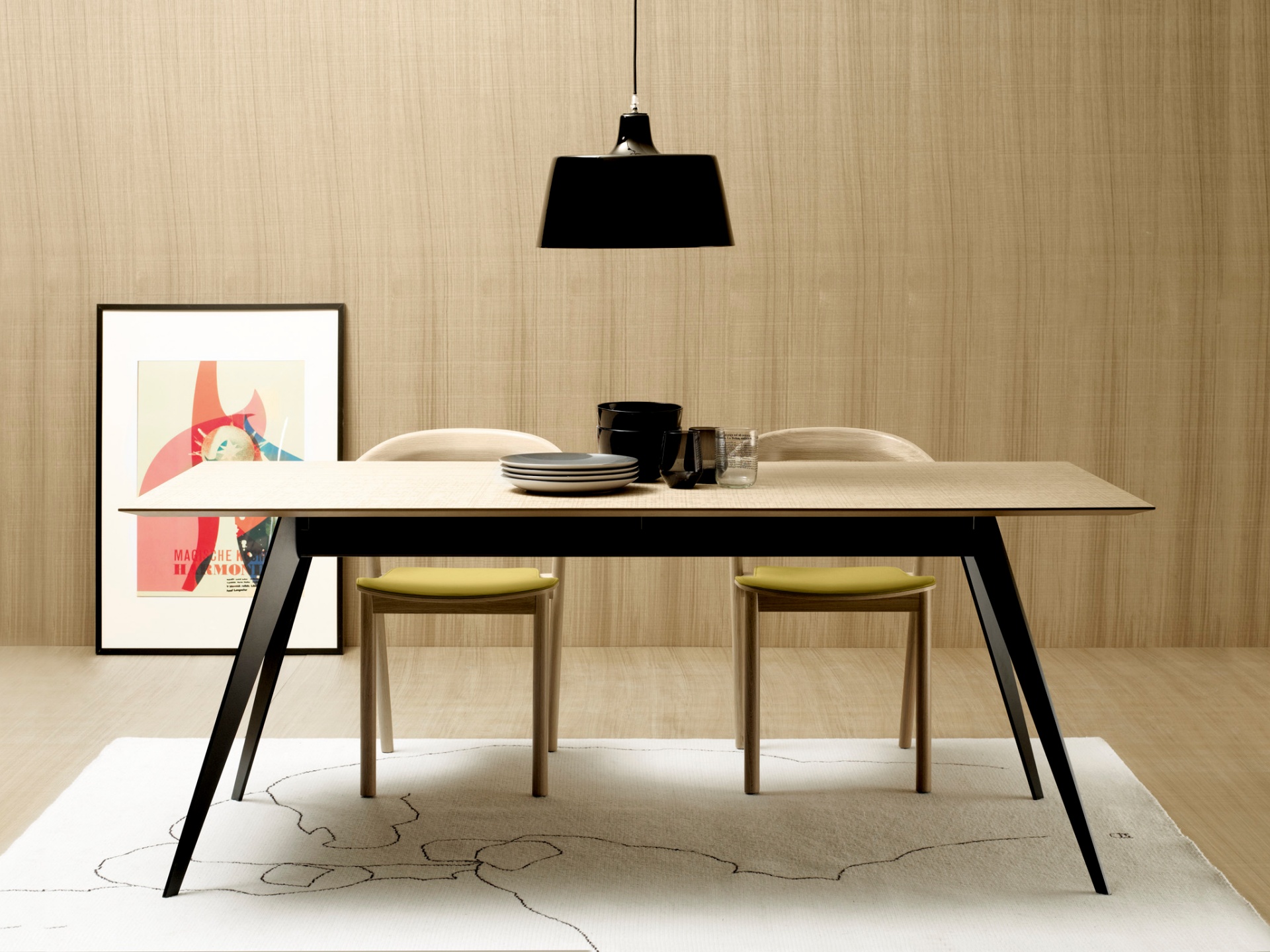Les tables Aise avec pieds en bois sont disponibles en version non extensible ou extensible.